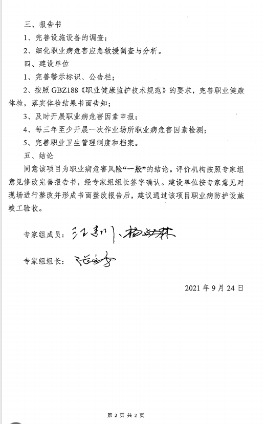 一、結(jié)論: 根據(jù)《國民經(jīng)濟行業(yè)分類》(GBT4754-2017),該項目間屬于“電力生產(chǎn)”中的“電力生產(chǎn)(其他)”。根據(jù)《關(guān)于公布建設(shè)項目職業(yè)病危害風險分類管理目錄的通知》(國衛(wèi)辦職健發(fā)〔2020〕5號),“電力生產(chǎn)(其他)”屬于職業(yè)病危害一般的建設(shè)項目。該項目產(chǎn)生或存在的職業(yè)病危害因素主要為噪聲,結(jié)合該項目職業(yè)病危害因素的潛在危險性、接觸人數(shù)、接觸時間、職業(yè)病危害防護措施等進行綜合分析,判定該項目屬于職業(yè)病危害“一般”的建設(shè)項目。 根據(jù)對該項目現(xiàn)場調(diào)查、職業(yè)病危害因素檢測結(jié)果和項目相關(guān)資料的綜合分析,該項目在實施過程中能夠落實有關(guān)職業(yè)病危害防護措施,在生產(chǎn)狀況正常,職業(yè)病危害防護設(shè)施正常運行的情況下,佩戴有效的個人防護用品,工人實際接觸的職業(yè)病危害因素的濃度/強度能夠控制在職業(yè)接觸限值內(nèi),符合國家有關(guān)職業(yè)衛(wèi)生標準、規(guī)范的要求。該項目已具備職業(yè)病防護設(shè)施竣工驗收的條件。 二、建議措施: (1)根據(jù)《工作場所職業(yè)衛(wèi)生管理規(guī)定》(國家衛(wèi)生健康委員會令〔2021〕5號令)第十五條:產(chǎn)生職業(yè)病危害的用人單位,應當在醒目位置設(shè)置公告欄,公布有關(guān)職業(yè)病防治的規(guī)章制度、操作規(guī)程、職業(yè)病危害事故應急救援措施和工作場所職業(yè)病危害因素檢測結(jié)果。 (2)根據(jù)《工作場所職業(yè)病危害警示標識》(GBZ158-2003),在作業(yè)場所出入口、作業(yè)崗位或顯著位置設(shè)置職業(yè)病危害警示標識、中文警示說明及職業(yè)病危害告知卡。對于設(shè)置工作,企業(yè)法人是第一責任人,負責職業(yè)健康工作的主要負責人和業(yè)務主管人員是設(shè)置公告欄的直接人,切實履行好職責和義務,積極開展工作。 (3)警示標識、告知卡每半年至少檢查一次,如發(fā)現(xiàn)有破損、變形、褪色等不符合要求時要及時修整或更換;除警示、告知外,建設(shè)方還可以在車間設(shè)置相關(guān)宣傳欄,公布有關(guān)職業(yè)病防治的規(guī)章制度、操作規(guī)程、職業(yè)病危害事故應急救援措施和工作場所職業(yè)病危害因素檢測結(jié)果,以加強工人意識教育。 (4)建設(shè)單位主要負責人和職業(yè)衛(wèi)生管理人員應參加職業(yè)衛(wèi)生監(jiān)管部門組織的職業(yè)衛(wèi)生培訓。 (5)公司與新老員工簽訂合同時,將工作過程中可能產(chǎn)生的職業(yè)病危害及其后果、職業(yè)病危害防護措施和待遇等如實告知,并在勞動合同中寫明。未與在崗員工簽訂職業(yè)病危害勞動告知合同的,應按國家職業(yè)病危害防治法律、法規(guī)的相關(guān)規(guī)定與員工進行補簽。 (6)員工在已訂立勞動合同期間,因工作崗位或者工作內(nèi)容變更,從事與所訂立勞動合同中未告知的存在職業(yè)病危害的作業(yè)時,由管理部門向員工如實告知,現(xiàn)所從事的工作崗位存在的職業(yè)病危害因素,并簽訂職業(yè)病危害因素告知補充合同。 (7)建設(shè)單位應根據(jù)《國家安全監(jiān)管總局辦公廳關(guān)于印發(fā)職業(yè)衛(wèi)生檔案管理規(guī)范的通知》(安監(jiān)總廳安健〔2013〕171號)的要求,建立健全職業(yè)衛(wèi)生檔案。包括:建設(shè)項目職業(yè)衛(wèi)生(三同時)、職業(yè)健康監(jiān)護管理檔案、宣傳培訓檔案、監(jiān)測與檢測評價檔案、職業(yè)衛(wèi)生管理檔案、員工個人職業(yè)健康檔案、法律法規(guī)等7大類檔案。 (8)根據(jù)《用人單位職業(yè)健康監(jiān)護監(jiān)督管理辦法》(國家安全生產(chǎn)監(jiān)督管理總局令〔2012〕第49號)建立、健全勞動者職業(yè)健康監(jiān)護檔案。 (9)該項目應按照國家有關(guān)法律、行政法規(guī)的規(guī)定,及時、如實申報職業(yè)危害。根據(jù)《職業(yè)病危害項目申報辦法》(國家安全生產(chǎn)監(jiān)督管理總局令第48號)第四條規(guī)定:職業(yè)危害申報工作實行屬地分級管理。 (10)該項目光伏場區(qū)所在地為海拔較高,高原地區(qū)大氣壓低,寒冷、干燥和陽光輻射強。運行檢修人員室外巡檢時,應注意防護。 (11)根據(jù)本次職業(yè)健康檢查結(jié)果表F8-5知:本次職業(yè)健康檢查所有人員存在血常規(guī)異常,4人出現(xiàn)頸椎生理曲度變直,以及部分其他異常。根據(jù)本次體檢結(jié)果,建議建設(shè)單位在該項目居住場所增加制氧機,配備符合人體工效學座椅。 |