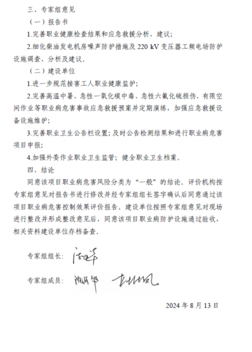 評價結論:根據(jù)對本項目現(xiàn)場調查、職業(yè)病危害因素檢測結果和項目相關資料的綜合分析,本項目當前(試運行階段)基本符合國家和地方對職業(yè)病防治方面法律、法規(guī)、標準的要求,本項目已具備職業(yè)病防護設施竣工驗收的條件。在生產(chǎn)狀況正常,職業(yè)病危害防護設施運行有效,工人佩戴合理有效的個體防護用品,其實際接觸的職業(yè)病危害因素的濃度/強度能夠控制在職業(yè)接觸限值內(nèi),且采取了控制效果評價報告所提對策措施和建議的情況下,符合國家和地方對職業(yè)病防治方面法律、法規(guī)、標準的要求。 建議: 1.1職業(yè)衛(wèi)生管理 1、該項目應定期委托有資質的檢測機構對工作場所內(nèi)職業(yè)病危害因素進行一次定期檢測,并對每次職業(yè)病危害因素檢測結果公示。 2、用人單位外委具有職業(yè)病危害的作業(yè)時,應書面告知給承包商工作場所存在的職業(yè)病危害以及相關要求,并采取措施達到防護條件,或配備個人職業(yè)病防護用品。 3、定期對在崗期間的勞動者進行職業(yè)衛(wèi)生培訓,根據(jù)實際情況制定培訓計劃,確定培訓周期。做好記錄及存檔工作。 4、本項目竣工驗收后,建設單位應按照本報告書識別的職業(yè)病危害因素進行申報。 5、該用人單位在作業(yè)場所設置了完善的警示標識,今后每半年至少應對其進行一次檢查,發(fā)現(xiàn)有破損、脫落、褪色、變形等不符合要求時,應按照《工作場所職業(yè)病危害警示標識》(GBZ158-2003)相關規(guī)定進行修整更換。 1.2個人防護用品 用人單位應當進一步完善個人防護用品的發(fā)放周期及使用監(jiān)管內(nèi)容,加強作業(yè)人員防護用品佩戴監(jiān)督,定期更換防護用品。 1.3職業(yè)健康監(jiān)護 該項目生產(chǎn)作業(yè)人員體檢因素還需進一步完善,將視屏作業(yè)納入職業(yè)健康體檢范疇。建議建設單位按照《職業(yè)健康監(jiān)護技術規(guī)范》(GBZ188-2014)相關規(guī)定,組織接觸職業(yè)病危害因素的作業(yè)人員到具有職業(yè)健康體檢資質的醫(yī)院進行在崗期間職業(yè)健康體檢,對新進員工進行崗前體檢,對離崗人員進行離崗體檢。 建設單位應按《中華人民共和國職業(yè)病防治法》中華人民共和國主席令〔2018〕第24號和《職業(yè)健康監(jiān)護技術規(guī)范》(GBZ188-2014)相關規(guī)定全面履行職業(yè)健康監(jiān)護工作,對新進作業(yè)人員進行崗前體檢、并對離崗或調離作業(yè)人員進行離崗健康檢查,根據(jù)體檢結果對作業(yè)人員按照《職業(yè)病防治法》等法律法規(guī)進行合理處置。 1.4外包作業(yè)建議 1、督促外包單位安排本項目維護檢修人員完善職業(yè)健康體檢項目。 2、對外包單位維護檢修作業(yè)勞動過程中職業(yè)病防護設施使用情況和個人防護用品佩戴進行監(jiān)督。 1.5應急救援建議 該項目存在六氟化硫急性中毒、職業(yè)中暑、一氧化碳急性中毒,建議建設單位進行六氟化硫急性中毒、一氧化碳急性中毒、職業(yè)中暑應急演練并加強應急救援防護。