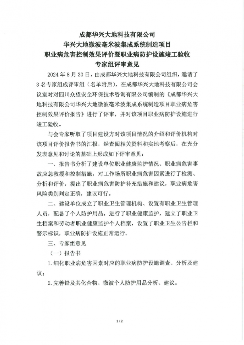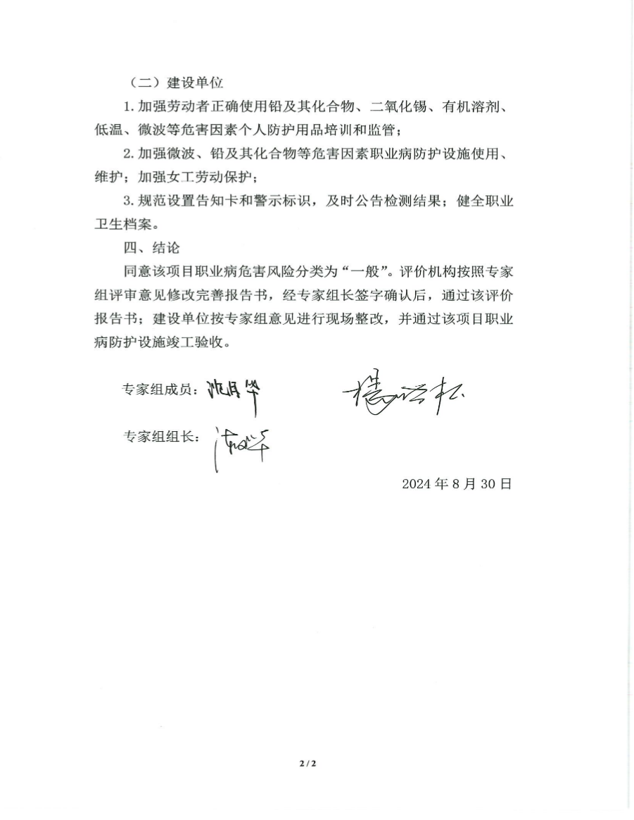 結(jié)論:本項(xiàng)目為職業(yè)病危害風(fēng)險程度一般的建設(shè)項(xiàng)目。 1不符合項(xiàng)及針對性建議 (1)在今后日常運(yùn)行過程中進(jìn)一步完善職業(yè)衛(wèi)生檔案的建設(shè)。 (2)建議制定完善職業(yè)病防治計劃和實(shí)施方案,防治計劃和實(shí)施方案應(yīng)包括防治目標(biāo)、防治措施、工作安排、經(jīng)費(fèi)概算等內(nèi)容。 2其他建議 (1)建設(shè)單位應(yīng)按照《工作場所職業(yè)衛(wèi)生管理規(guī)定》(中華人民共和國國家衛(wèi)生健康委員會令〔2020〕第5號)第二十條規(guī)定:職業(yè)病危害一般的用人單位,應(yīng)當(dāng)委托具有相應(yīng)資質(zhì)的職業(yè)衛(wèi)生技術(shù)服務(wù)機(jī)構(gòu),每三年至少進(jìn)行一次職業(yè)病危害因素檢測。檢測、評價結(jié)果應(yīng)當(dāng)存入本單位職業(yè)衛(wèi)生檔案,并向衛(wèi)生健康主管部門報告和勞動者公布。 (2)建設(shè)單位應(yīng)當(dāng)按照《職業(yè)病危害項(xiàng)目申報辦法》(國家安全生產(chǎn)監(jiān)督管理總局令〔2012〕第48號)的規(guī)定,及時、如實(shí)向所在地衛(wèi)生健康主管部門申報職業(yè)病危害項(xiàng)目,并接受衛(wèi)生健康主管部門的監(jiān)督檢查。 (3)建設(shè)單位應(yīng)加強(qiáng)職業(yè)衛(wèi)生防護(hù)設(shè)施的管理和維護(hù),定期進(jìn)行檢查、保養(yǎng),并做好相應(yīng)的記錄,定期進(jìn)行防護(hù)效率的檢查,對不符合要求的進(jìn)行維護(hù)及更新。 (4)按照《中華人民共和國職業(yè)病防治法》(主席令〔2018〕第24號修改)的要求,建設(shè)單位不得將產(chǎn)生職業(yè)病危害的作業(yè)轉(zhuǎn)移、外包給不具備職業(yè)衛(wèi)生防護(hù)條件的企業(yè)。 (5)本項(xiàng)目應(yīng)加強(qiáng)女工的勞動保護(hù),建設(shè)單位不得安排孕期、哺乳期的女職工從事對本人和胎兒、嬰兒有危害的作業(yè)(測試、焊接)。 (6)建設(shè)單位主要負(fù)責(zé)人和職業(yè)衛(wèi)生管理人員應(yīng)當(dāng)具備與本單位所從事的生產(chǎn)經(jīng)營活動相適應(yīng)的職業(yè)衛(wèi)生知識和管理能力,并接受職業(yè)衛(wèi)生培訓(xùn)。 (7)可以根據(jù)本項(xiàng)目的實(shí)際情況,為接觸微波的作業(yè)人員配備微波防護(hù)服。 (8)焊接作業(yè)人員進(jìn)入生產(chǎn)現(xiàn)場應(yīng)正確配到勞保用品(工作服、口罩、手套等),下班后不要將工作服帶離工作場所,工作中喝水前洗手。