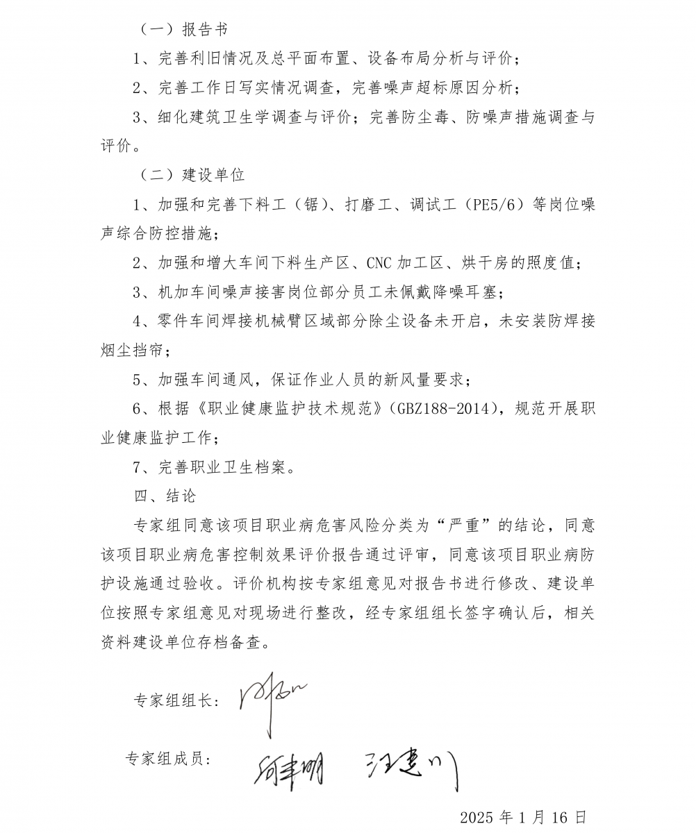 結(jié)論:項目控制效果評價判定為“職業(yè)病危害風(fēng)險分類嚴(yán)重”的建設(shè)項目。 根據(jù)對本項目現(xiàn)場調(diào)查、職業(yè)病危害因素檢測結(jié)果和項目相關(guān)資料的綜合分析,本項目職業(yè)衛(wèi)生防治工作符合國家法律、法規(guī)的相關(guān)規(guī)定,采取的職業(yè)病防治措施基本可行,日常運(yùn)行過程中在一定程度上能控制和降低職業(yè)病危害因素對作業(yè)人員健康的影響,項目在落實了本次評價報告提出的補(bǔ)充措施和建議后,能夠滿足職業(yè)病防治工作的需要。本項目已具備職業(yè)病防護(hù)設(shè)施竣工驗收的條件。 建議: (1)車間加強(qiáng)通風(fēng)要求,保證作業(yè)人員的新風(fēng)量要求。 (2)根據(jù)《職業(yè)健康監(jiān)護(hù)技術(shù)規(guī)范》(GBZ188-2014)結(jié)合項目實際情況,做好健康監(jiān)護(hù)工作,“兩檔”管理制度。“兩檔”內(nèi)容包括職業(yè)衛(wèi)生檔案和職業(yè)健康監(jiān)護(hù)檔案。 (3)按照《用人單位職業(yè)健康監(jiān)護(hù)監(jiān)督管理辦法》(國家安監(jiān)總局令〔2012〕第49號)、《職業(yè)健康監(jiān)護(hù)技術(shù)規(guī)范》(GBZ188-2014)相關(guān)規(guī)定對新進(jìn)或調(diào)崗作業(yè)人員進(jìn)行崗前體檢、并對離崗或調(diào)離作業(yè)人員進(jìn)行離崗健康檢查。 (4)建設(shè)單位應(yīng)按照《工作場所職業(yè)衛(wèi)生管理規(guī)定》(國家衛(wèi)生健康委員會令〔2020〕第5號)的規(guī)定:職業(yè)病危害嚴(yán)重的用人單位,應(yīng)當(dāng)委托具有相應(yīng)資質(zhì)的職業(yè)衛(wèi)生技術(shù)服務(wù)機(jī)構(gòu),每年至少進(jìn)行一次職業(yè)病危害因素檢測,每三年至少進(jìn)行一次職業(yè)病危害現(xiàn)狀評價。檢測、評價結(jié)果應(yīng)當(dāng)存入本單位職業(yè)衛(wèi)生檔案,并向衛(wèi)生健康主管部門報告和勞動者公布。 (5)建設(shè)單位應(yīng)根據(jù)《職業(yè)病危害項目申報辦法》(國家安全生產(chǎn)監(jiān)督管理總局令第48號)的規(guī)定,將此次控制效果評價報告與職業(yè)病危害因素現(xiàn)場檢測結(jié)果向當(dāng)?shù)刂鞴懿块T進(jìn)行申報。 (6)根據(jù)《國家衛(wèi)生健康委辦公廳關(guān)于進(jìn)一步加強(qiáng)用人單位職業(yè)健康培訓(xùn)工作的通知》國衛(wèi)辦職健函〔2022〕441號的要求進(jìn)行職業(yè)衛(wèi)生培訓(xùn)。 (7)定期對除塵、廢氣處理設(shè)施進(jìn)行檢查、維護(hù),發(fā)現(xiàn)有堵塞、損壞或其他原因?qū)е虏荒苷9ぷ鞯?,?yīng)及時進(jìn)行清理、設(shè)備維修,并做好相關(guān)維護(hù)保養(yǎng)記錄。 (8)加強(qiáng)噪聲作業(yè)人員的個體防護(hù)和職業(yè)健康監(jiān)護(hù)。 (9)加強(qiáng)外委作業(yè)人員的職業(yè)衛(wèi)生管理,對焊工、打磨工加強(qiáng)個體防護(hù)和職業(yè)健康監(jiān)護(hù)。 (10)建設(shè)單位應(yīng)加強(qiáng)女工的勞動保護(hù),不得安排孕期、哺乳期的女職工從事對本人和胎兒、嬰兒有危害的作業(yè)。 (11)應(yīng)急救援物資的使用人員,應(yīng)接受相應(yīng)的培訓(xùn),熟悉裝備的用途、技術(shù)性能及有關(guān)使用說明資料,并遵守操作規(guī)程;及時對車間內(nèi)配備的應(yīng)急救援藥箱進(jìn)行檢查,對應(yīng)急救援藥品進(jìn)行有效性查驗,及時補(bǔ)充更換。 (12)粉塵防爆措施嚴(yán)格以安全評價報告、安全設(shè)施設(shè)計專篇提出的措施為準(zhǔn)。 (13)針對維修、清污存在的受限空間作業(yè)危害,應(yīng)加強(qiáng)受限空間作業(yè)監(jiān)管,嚴(yán)格按照《缺氧危險作業(yè)安全規(guī)程》(GB8958-2006)、《密閉空間作業(yè)職業(yè)危害防護(hù)規(guī)范》(GBZ/T205-2007)進(jìn)行作業(yè)。 (14)本次職業(yè)病危害控制效果評價只針對目前生產(chǎn)狀況,公司今后遇單位名稱、法定代表人或者負(fù)責(zé)人發(fā)生變更,須按時申報;或因技術(shù)、工藝或原輔材料發(fā)生改變而引起職業(yè)病危害因素發(fā)生變化時,應(yīng)進(jìn)一步進(jìn)行職業(yè)病危害因素評價。 |