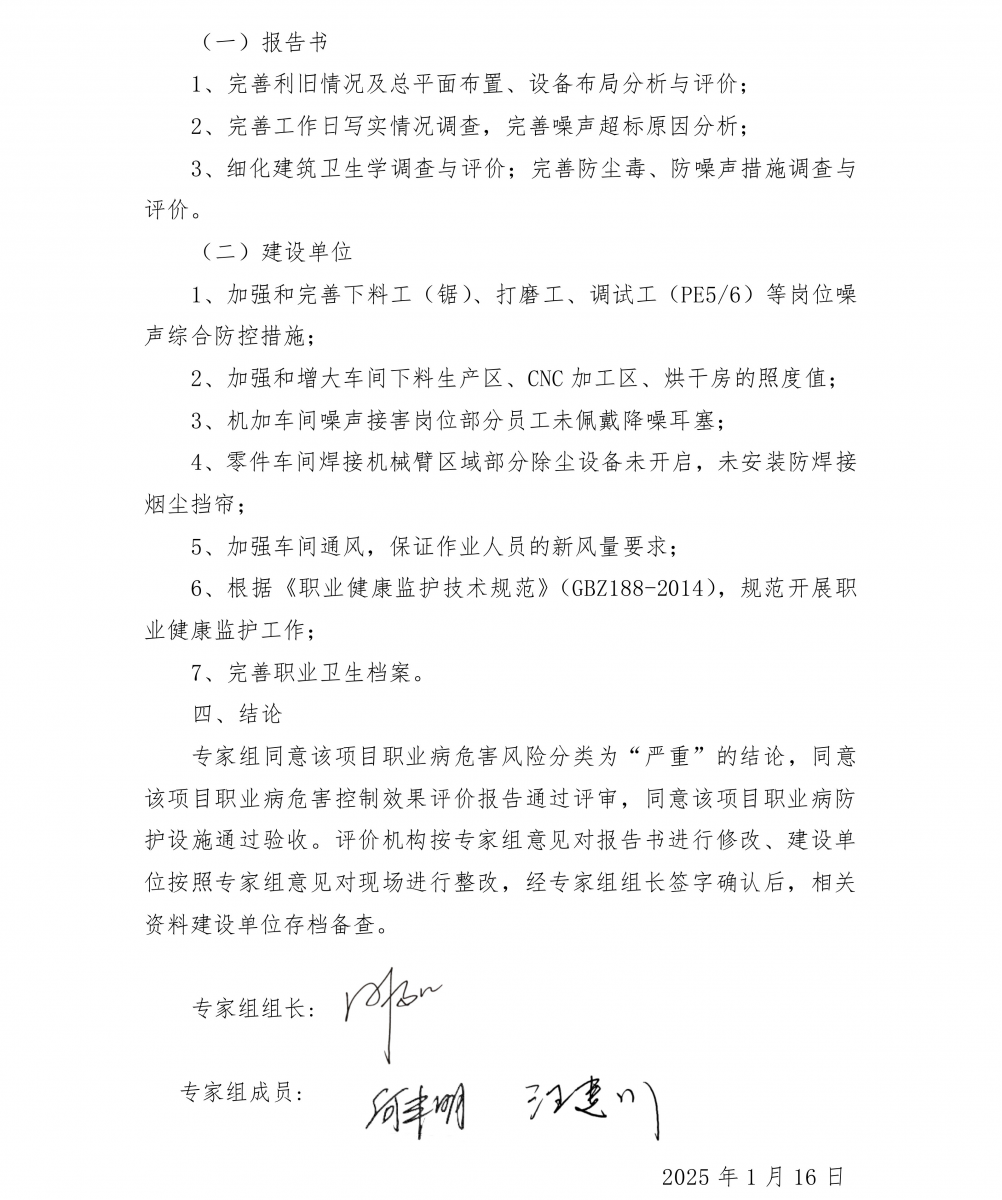 結(jié)論:項(xiàng)目控制效果評(píng)價(jià)判定為“職業(yè)病危害風(fēng)險(xiǎn)分類嚴(yán)重”的建設(shè)項(xiàng)目。 根據(jù)對(duì)本項(xiàng)目現(xiàn)場(chǎng)調(diào)查、職業(yè)病危害因素檢測(cè)結(jié)果和項(xiàng)目相關(guān)資料的綜合分析,本項(xiàng)目職業(yè)衛(wèi)生防治工作符合國(guó)家法律、法規(guī)的相關(guān)規(guī)定,采取的職業(yè)病防治措施基本可行,日常運(yùn)行過程中在一定程度上能控制和降低職業(yè)病危害因素對(duì)作業(yè)人員健康的影響,項(xiàng)目在落實(shí)了本次評(píng)價(jià)報(bào)告提出的補(bǔ)充措施和建議后,能夠滿足職業(yè)病防治工作的需要。本項(xiàng)目已具備職業(yè)病防護(hù)設(shè)施竣工驗(yàn)收的條件。 建議: (1)車間加強(qiáng)通風(fēng)要求,保證作業(yè)人員的新風(fēng)量要求。 (2)根據(jù)《職業(yè)健康監(jiān)護(hù)技術(shù)規(guī)范》(GBZ188-2014)結(jié)合項(xiàng)目實(shí)際情況,做好健康監(jiān)護(hù)工作,“兩檔”管理制度。“兩檔”內(nèi)容包括職業(yè)衛(wèi)生檔案和職業(yè)健康監(jiān)護(hù)檔案。 (3)按照《用人單位職業(yè)健康監(jiān)護(hù)監(jiān)督管理辦法》(國(guó)家安監(jiān)總局令〔2012〕第49號(hào))、《職業(yè)健康監(jiān)護(hù)技術(shù)規(guī)范》(GBZ188-2014)相關(guān)規(guī)定對(duì)新進(jìn)或調(diào)崗作業(yè)人員進(jìn)行崗前體檢、并對(duì)離崗或調(diào)離作業(yè)人員進(jìn)行離崗健康檢查。 (4)建設(shè)單位應(yīng)按照《工作場(chǎng)所職業(yè)衛(wèi)生管理規(guī)定》(國(guó)家衛(wèi)生健康委員會(huì)令〔2020〕第5號(hào))的規(guī)定:職業(yè)病危害嚴(yán)重的用人單位,應(yīng)當(dāng)委托具有相應(yīng)資質(zhì)的職業(yè)衛(wèi)生技術(shù)服務(wù)機(jī)構(gòu),每年至少進(jìn)行一次職業(yè)病危害因素檢測(cè),每三年至少進(jìn)行一次職業(yè)病危害現(xiàn)狀評(píng)價(jià)。檢測(cè)、評(píng)價(jià)結(jié)果應(yīng)當(dāng)存入本單位職業(yè)衛(wèi)生檔案,并向衛(wèi)生健康主管部門報(bào)告和勞動(dòng)者公布。 (5)建設(shè)單位應(yīng)根據(jù)《職業(yè)病危害項(xiàng)目申報(bào)辦法》(國(guó)家安全生產(chǎn)監(jiān)督管理總局令第48號(hào))的規(guī)定,將此次控制效果評(píng)價(jià)報(bào)告與職業(yè)病危害因素現(xiàn)場(chǎng)檢測(cè)結(jié)果向當(dāng)?shù)刂鞴懿块T進(jìn)行申報(bào)。 (6)根據(jù)《國(guó)家衛(wèi)生健康委辦公廳關(guān)于進(jìn)一步加強(qiáng)用人單位職業(yè)健康培訓(xùn)工作的通知》國(guó)衛(wèi)辦職健函〔2022〕441號(hào)的要求進(jìn)行職業(yè)衛(wèi)生培訓(xùn)。 (7)定期對(duì)除塵、廢氣處理設(shè)施進(jìn)行檢查、維護(hù),發(fā)現(xiàn)有堵塞、損壞或其他原因?qū)е虏荒苷9ぷ鞯模瑧?yīng)及時(shí)進(jìn)行清理、設(shè)備維修,并做好相關(guān)維護(hù)保養(yǎng)記錄。 (8)加強(qiáng)噪聲作業(yè)人員的個(gè)體防護(hù)和職業(yè)健康監(jiān)護(hù)。 (9)加強(qiáng)外委作業(yè)人員的職業(yè)衛(wèi)生管理,對(duì)焊工、打磨工加強(qiáng)個(gè)體防護(hù)和職業(yè)健康監(jiān)護(hù)。 (10)建設(shè)單位應(yīng)加強(qiáng)女工的勞動(dòng)保護(hù),不得安排孕期、哺乳期的女職工從事對(duì)本人和胎兒、嬰兒有危害的作業(yè)。 (11)應(yīng)急救援物資的使用人員,應(yīng)接受相應(yīng)的培訓(xùn),熟悉裝備的用途、技術(shù)性能及有關(guān)使用說明資料,并遵守操作規(guī)程;及時(shí)對(duì)車間內(nèi)配備的應(yīng)急救援藥箱進(jìn)行檢查,對(duì)應(yīng)急救援藥品進(jìn)行有效性查驗(yàn),及時(shí)補(bǔ)充更換。 (12)粉塵防爆措施嚴(yán)格以安全評(píng)價(jià)報(bào)告、安全設(shè)施設(shè)計(jì)專篇提出的措施為準(zhǔn)。 (13)針對(duì)維修、清污存在的受限空間作業(yè)危害,應(yīng)加強(qiáng)受限空間作業(yè)監(jiān)管,嚴(yán)格按照《缺氧危險(xiǎn)作業(yè)安全規(guī)程》(GB8958-2006)、《密閉空間作業(yè)職業(yè)危害防護(hù)規(guī)范》(GBZ/T205-2007)進(jìn)行作業(yè)。 (14)本次職業(yè)病危害控制效果評(píng)價(jià)只針對(duì)目前生產(chǎn)狀況,公司今后遇單位名稱、法定代表人或者負(fù)責(zé)人發(fā)生變更,須按時(shí)申報(bào);或因技術(shù)、工藝或原輔材料發(fā)生改變而引起職業(yè)病危害因素發(fā)生變化時(shí),應(yīng)進(jìn)一步進(jìn)行職業(yè)病危害因素評(píng)價(jià)。 |