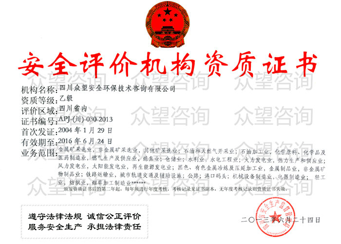 本公司于2004年取得安全評(píng)價(jià)機(jī)構(gòu)資質(zhì)證書(shū),經(jīng)過(guò)十年發(fā)展,公司完成了數(shù)千項(xiàng)安全評(píng)價(jià)項(xiàng)目,積累了大量經(jīng)驗(yàn),匯聚了大量人才,現(xiàn)有國(guó)家注冊(cè)安全評(píng)價(jià)工程師41人,能從事金屬礦采選業(yè)、石油和天然氣開(kāi)采業(yè)、化工及醫(yī)藥制造業(yè)、倉(cāng)儲(chǔ)業(yè)、水利業(yè)、輕工業(yè)等31個(gè)行業(yè)的建設(shè)項(xiàng)目的安全預(yù)評(píng)價(jià)、安全現(xiàn)狀評(píng)價(jià)、安全驗(yàn)收評(píng)價(jià)工作。